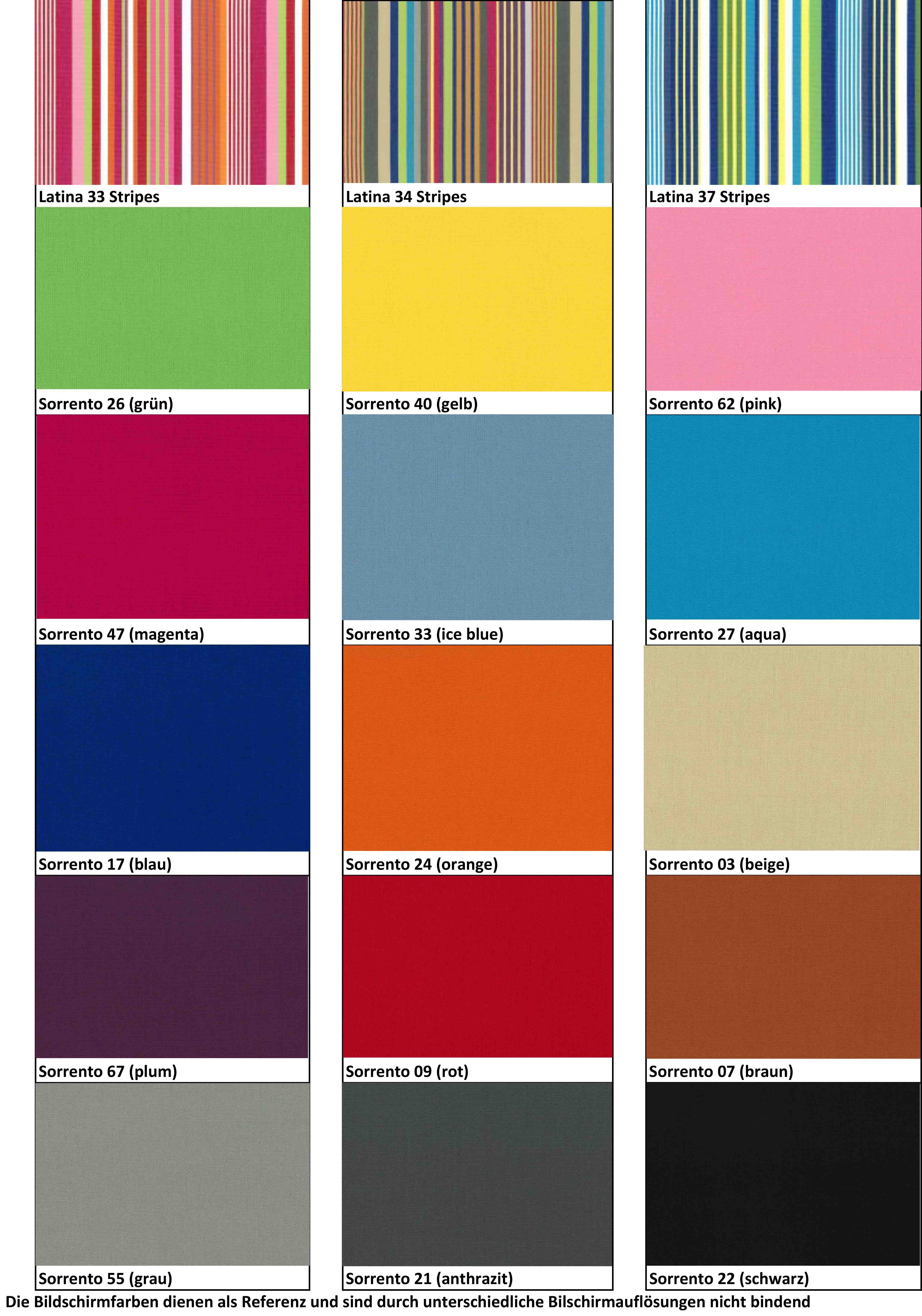 Die Sunbrella Stoffe der Polster bestehen ausschließlich aus spinndüsengefärbten Acrylfasern und sind besonders farbbeständig, schmutz- und wasserabweisend, pflegeleicht, atmungsaktiv und schimmelbeständig.