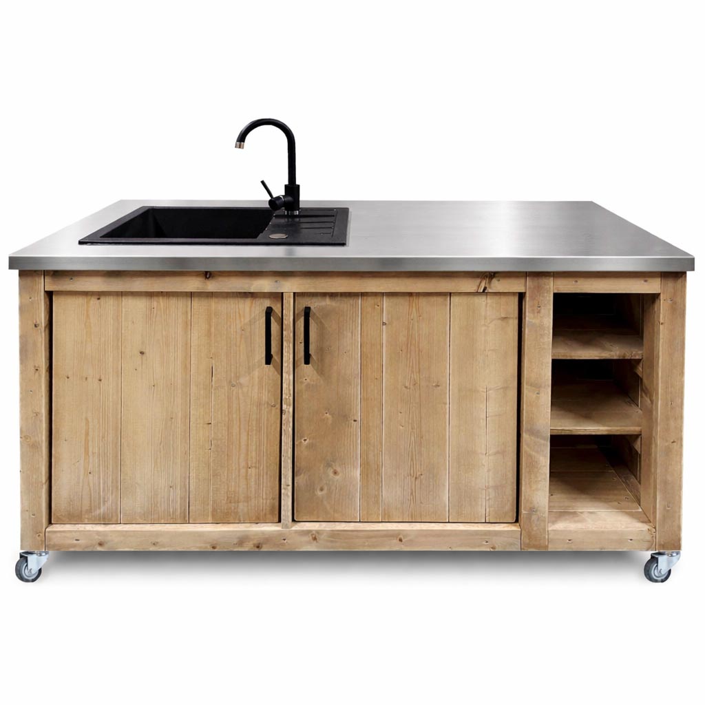 Bauholz Grilltisch & Outdoorküche aus Holz PERTHONE-B32 Wetterfeste Outdoor Küche und BBQ Möbel im Bauholz-Style Der PERTHONE-B32 Grilltisch kombiniert robustes, massiv behandeltes Bauholz mit praktischer Funktionalität und rustikalem Design für den Außenbereich. Die großzügige Arbeitsfläche eignet sich optimal zum Grillen, Zubereiten und Servieren, während stabile Konstruktion, integrierter Stauraum und durchdachte Details effizientes Arbeiten ermöglichen. Das natürliche Bauholz schafft eine warme, charaktervolle Optik und macht die Outdoorküche zum zentralen Highlight auf Terrasse oder im Garten. Langlebig, wetterbeständig und vielseitig einsetzbar als Grillstation, Outdoor Küche oder Bar Tresen überzeugt dieses Modell durch Qualität, Design und handwerkliche Verarbeitung. Maße:Breite: 185 cm Tiefe: 80 cmHöhe: 90 cm incl. Rollen (Höhe mit Regalaufbau 120 cm)(Maße, Gewicht und Farbgebung können materialbedingt minimal abweichen)Material:Neuholz Kiefer / Fichte, Standard Auslieferung in Vintage gebeizt und holzschutz-lasiert.Auf Wunsch gerne auch unbehandelt naturEigenschaften:Massiv gebaute Grilltisch / Outdoorküchen Kombination bestehend aus 2 ModulenArbeitsfläche & Regal aus 4 cm starken Kiefer/Fichte Bohlen1 Türmodul mit Soft-Close Scharnieren 1 Schubladenmodul mit 3 geräumigen SchubladenEine 5-fach Edelstahl Hakenleiste8 Schwerlastrollen (davon 4 mit Feststeller) Spülbecken-Einheit:massive Granit-Spüle, 80% Granitzuschlagstoff, 20% Harz60 x 44 cm (B x T)Einhebelmischer Warmwasser-Boiler (OPTIONAL):Energieeffizienzklasse ANenninhalt 5 L / Mischwassermenge 40°CAnschlussleistung 2 KWH: 41,8 B: 25,2 T: 22,2 cmDatenblatt im Fotobereich Induktionskochfeld2 Induktionsfelder, 3500 WThermo-Boost-Funktion für schnelle Erhitzung jeder ZoneIntelligente Eco-Wärmekontrolle zur EnergieeinsparungTouch-Bedienfeld und Digitalanzeige, abnehmbarer MagnetdrehreglerTopferkennung, Überhitzungsschutz, Timer, Kindersicherung Kühlschrank:Energieeffizienzklasse DB: 47 x H: 63 x T: 52,5 cm / Nutzinhalt 60 L, Kühlbereich 3-10 GradLED Innenbeleuchtung weiß2 Einlegeböden flexibel einsetzbarTüranschlag rechts, nicht wechselbarDatenblatt im FotobereichWarnhinweis: Kühlschrank vor Inbetriebnahme 2 Tage nicht ans Stromnetz anschließen. Bei Nichtnutzung vom Stromnetz nehmen und Türe leicht geöffnet lassenLieferzustand:Originalverpackt & NeuArtikel wird fertig montiert geliefert (Ausnahme: Rollen und Hakenleiste)Dekorationen im Lieferumfang nicht enthaltenVersand:Versandkosten (nach Volumen / Gewicht) sind im jeweiligen Warenkorb ersichtlichVersand auf Inseln und ins Ausland nur auf Anfrage Elektro-Bauteile sind vor Feuchtigkeit und Witterung zu schützen.Installationshinweis: Der Anschluss an das Stromnetz darf nur durch eine autorisierte Elektrofachkraft erfolgen, die beim örtlichen Energieversorgungsunternehmen zugelassen ist. Nicht autorisierte Personen dürfen keine willkürlichen Veränderungen oder Änderungen an der Elektroinstallation vornehmen. Sanitär-/Wasseranschlüsse sind durch Kunden bzw. einen Fachbetrieb zu erfolgen.
