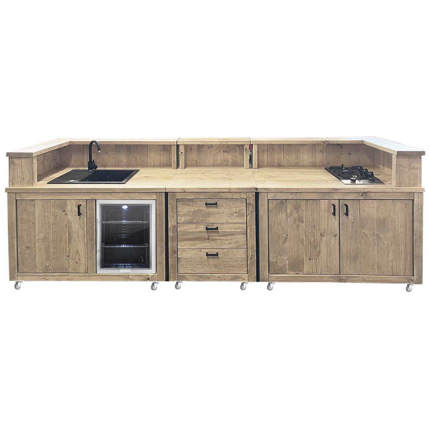 Bauholz Outdoorküche & Grilltisch PERTHONE KITCHEN WOOD Markante BBQ Station im massiven Holzdesign Die PERTHONE KITCHEN WOOD Outdoorküche steht für authentisches Bauholz-Design, solide Verarbeitung und langlebige Qualität im Außenbereich. Gefertigt aus massivem, witterungsresistent behandeltem Holz bietet sie eine belastbare Arbeitsfläche für komfortables Grillen, Anrichten und Servieren. Die kraftvolle Konstruktion sorgt für hohe Stabilität, während integrierte Funktionsbereiche effiziente Organisation von Grillzubehör und Utensilien ermöglichen. Mit ihrer ausdrucksstarken Holzstruktur wird diese Outdoor Küche zum stilprägenden Mittelpunkt auf Terrasse oder im Garten und überzeugt als vielseitig einsetzbare Grillstation mit nachhaltigem Charakter und professionellem Anspruch. Maße:Breite: 240 cmTiefe: 80 cmHöhe: 90 cm incl. RollenMaße, Gewicht und Farbgebung können materialbedingt minimal abweichenMaterial:Neuholz Kiefer / Fichte, Standard Auslieferung in Vintage gebeizt und holzschutz-lasiertAuf Wunsch auch unbehandelt naturEigenschaften:Massiv gebauter Grilltisch / Grillwagen mit UnterschrankArbeitsfläche aus 4 cm starken Kiefer/Fichte Bohlen3 bzw 4 Türen mit Softclose Scharnieren2-teiliger Innenraum mit Fachboden 5-fach Edelstahl Hakenleiste8 Schwerlastrollen (davon 4 mit Feststeller Kühlschrank (Option):Energieeffizienzklasse DB: 47 x H: 63 x T: 52,5 cm / Nutzinhalt 60 L, Kühlbereich 3-10 GradLED Innenbeleuchtung weiß2 Einlegeböden flexibel einsetzbarTüranschlag rechts, nicht wechselbarDatenblatt im FotobereichWarnhinweis: Kühlschrank vor Inbetriebnahme 2 Tage nicht ans Stromnetz anschließen. Bei Nichtnutzung vom Stromnetz nehmen und Türe leicht geöffnet lassen Glaskeramik-Kochfeld (Option)59 x 52 cm4 Kochfelder, 9 Heizstufen, SensorbedienungDatenblatt im Fotobereich Spülbecken-Einheit incl. Warmwasserboiler (Option):massive Granit-Spüle, 80% Granitzuschlagstoff, 20% Harz60 x 44 cm (B x T)Einhebelmischer Warmwasserboiler:Energieeffizienzklasse ANenninhalt 5 L / Mischwassermenge 40°CAnschlussleistung 2 KWH: 41,8 B: 25,2 T: 22,2 cmDatenblatt im FotobereichLieferzustand:Originalverpackt & NeuArtikel wird fertig montiert geliefert (Ausnahme: Rollen und Hakenleisten)Dekorationen im Lieferumfang nicht enthaltenVersand:Versandkosten (nach Volumen / Gewicht) sind im jeweiligen Warenkorb ersichtlichVersand auf Inseln und ins Ausland nur auf AnfrageElektro-Bauteile sind vor Feuchtigkeit und Witterung zu schützen.Installationshinweis: Der Anschluss an das Stromnetz darf nur durch eine autorisierte Elektrofachkraft erfolgen, die beim örtlichen Energieversorgungsunternehmen zugelassen ist. Nicht autorisierte Personen dürfen keine willkürlichen Veränderungen oder Änderungen an der Elektroinstallation vornehmen.Sanitär-/Wasseranschlüsse sind durch Kunden bzw. einen Fachbetrieb zu erfolgen.