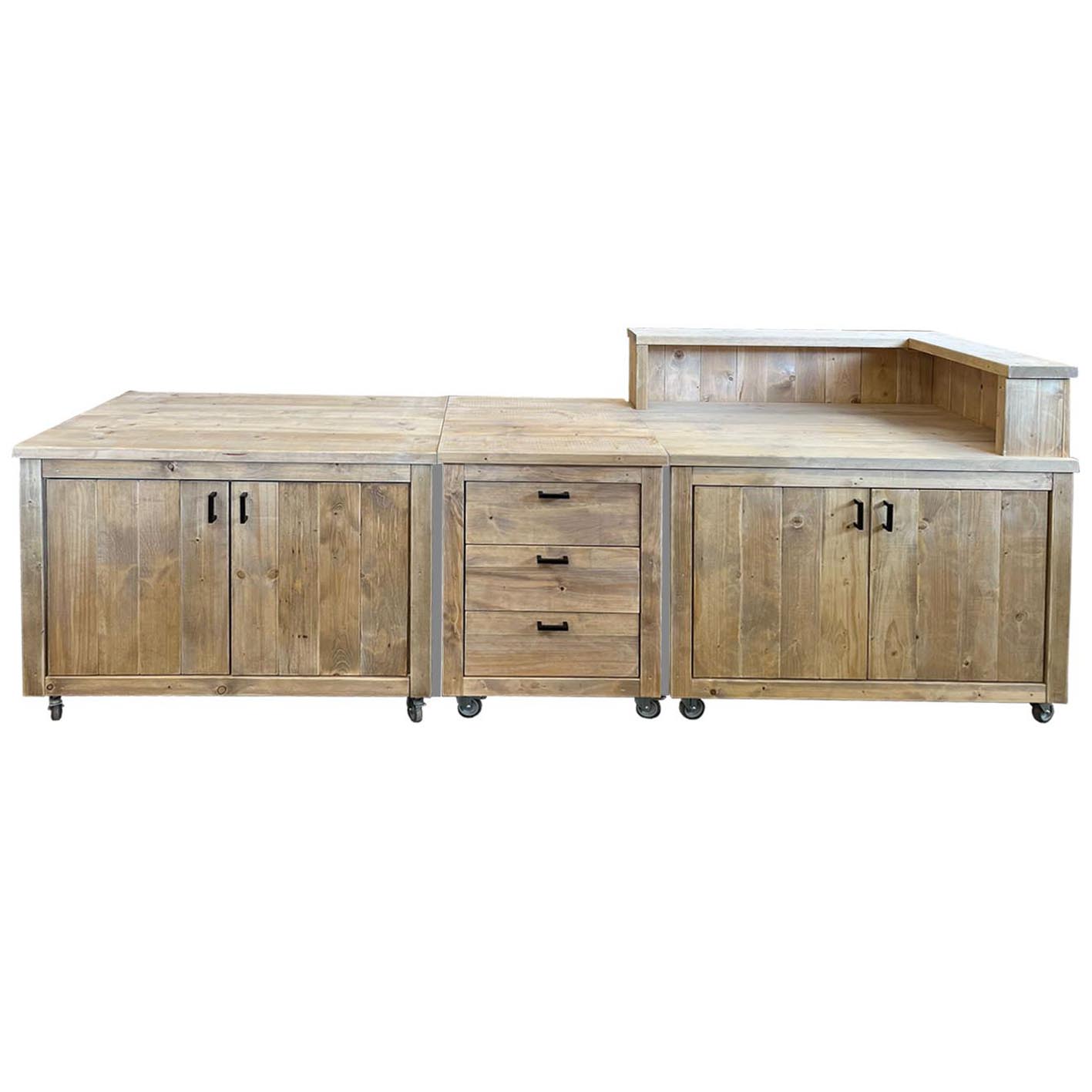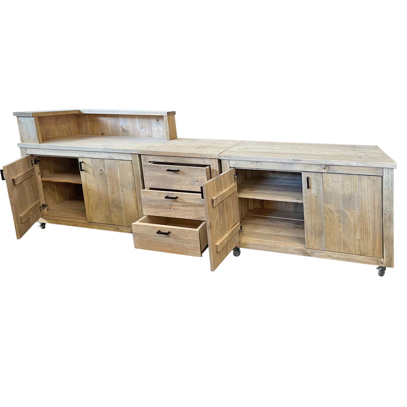 Die 4 cm starken Fichte/Kiefer Bohlen der Arbeitsfläche und Aufbau stehen für die massive Bauart. Reichlich Stauraum findet sich auch hinter den Türen, geteilt durch einen mittig montierten Fachboden. 12 Schwerlast-Rollen (6 davon mit Stopp-Funktion) machen diese Kombination gleichzeitig auch zu einem flexiblen Möbelstück, das mühelos den perfekten Standort und Einteilung findet.