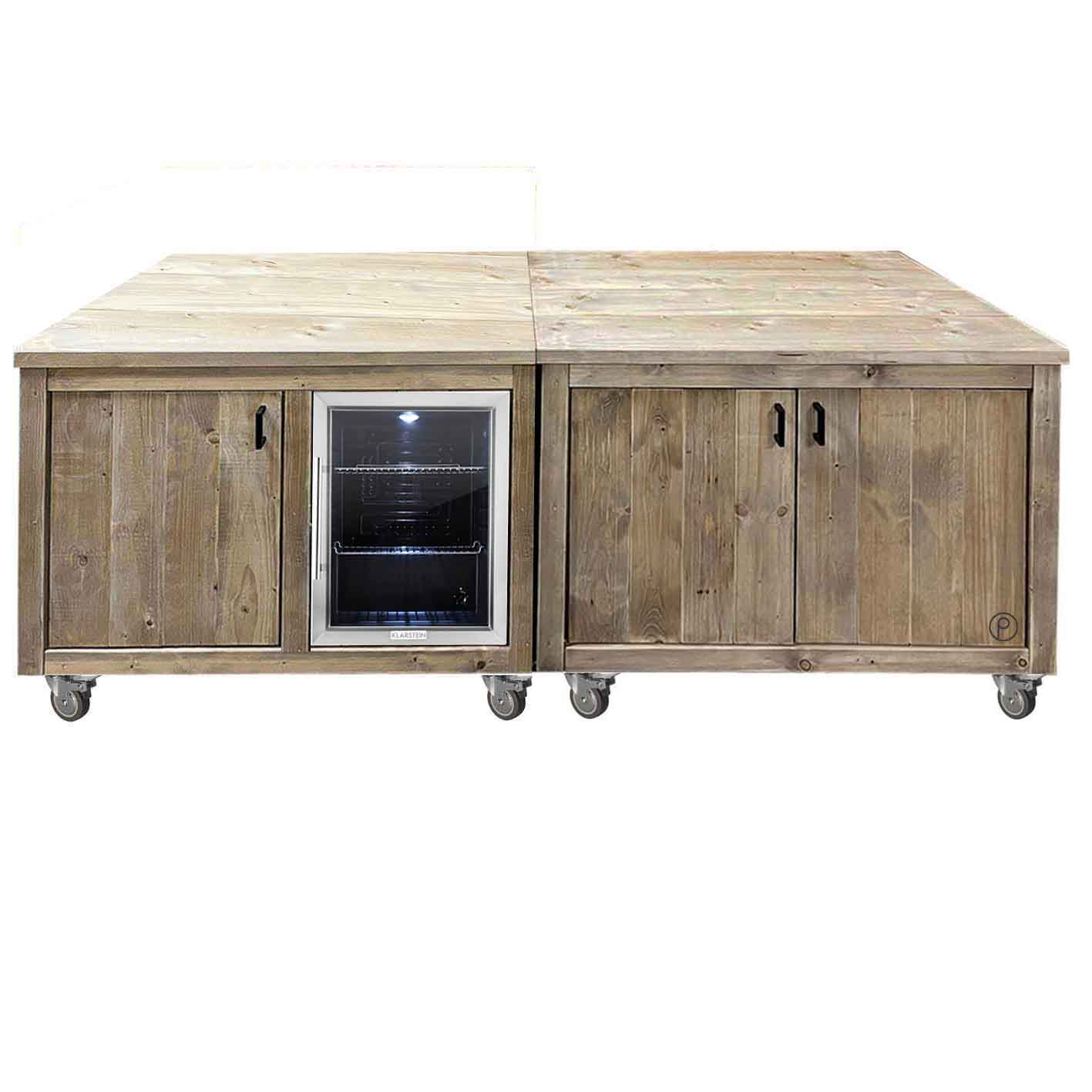 Die 4 cm starken Fichte/Kiefer Bohlen der Arbeitsfläche stehen für die massive Bauart. Reichlich Stauraum findet sich auch hinter den Türen. 8 Schwerlast-Rollen (4 davon mit Stopp-Funktion) machen diese Outdoorküche gleichzeitig auch zu einem flexiblen Möbelstück, das mühelos den perfekten Standort findet