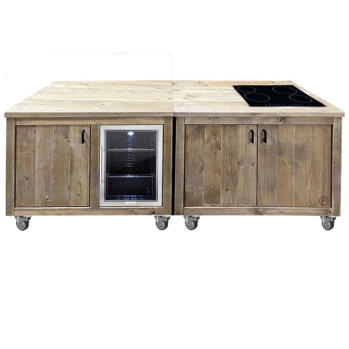 Grilltisch - Outdoorküche aus massivem Neuholz in typischem Bauholz Design Groß und dennoch durch die 2-teilige Konstruktion universell einsetzbar nicht nur in jedem Garten, oder auf der Terrasse... dieses Prachtstück ist ein wahrer Hingucker auch in der Gastronomie. 5 unterschiedliche Ausführungen stehen zur Verfügung, weitere Varianten gerne auf Anfrage.Die 4 cm starken Fichte/Kiefer Bohlen der Arbeitsfläche und Aufbau stehen für die massive Bauart. Reichlich Stauraum findet sich auch hinter den Türen. 8 Schwerlast-Rollen (4 davon mit Stopp-Funktion) machen diese Outdoorküche gleichzeitig auch zu einem flexiblen Möbelstück, das mühelos den perfekten Standort findetMaße:Breite: 240 cmTiefe: 80 cmHöhe: 120 cm incl. Rollen (Höhe Arbeitsfläche: 90 cm)Maße, Gewicht und Farbgebung können materialbedingt minimal abweichenMaterial:Neuholz Kiefer / Fichte, Standard Auslieferung in Vintage gebeizt und holzschutz-lasiert.Auf Wunsch gerne auch unbehandelt naturEigenschaften:Massiv gebauter Grilltisch / Grillwagen mit UnterschrankArbeitsfläche & Regal aus 4 cm starken Kiefer/Fichte Bohlen3 bzw 4 Türen mit Softclose Scharnieren2-teiliger Innenraum mit Fachboden2x 5-fach Edelstahl Hakenleiste8 Schwerlastrollen (davon 2 mit Feststeller Kühlschrank (Option):Energieeffizienzklasse DB: 47 x H: 63 x T: 52,5 cm / Nutzinhalt 60 L, Kühlbereich 3-10 GradLED Innenbeleuchtung weiß2 Einlegeböden flexibel einsetzbarTüranschlag rechts, nicht wechselbarDatenblatt im FotobereichWarnhinweis: Kühlschrank vor Inbetriebnahme 2 Tage nicht ans Stromnetz anschließen. Bei Nichtnutzung vom Stromnetz nehmen und Türe leicht geöffnet lassen Glaskeramik-Kochfeld (Option):Maße 59 x 52 cmGesamtleistung 7200 Watt4 Kochfelder, 17 Heizstufen pro Kochfeld, SensorbedienungFür jedes Kochgeschirr geeignetDatenblatt im FotobereichSpülbecken-Einheit incl. Warmwasserboiler (Option):massive Granit-Spüle, 80% Granitzuschlagstoff, 20% Harz60 x 44 cm (B x T)Einhebelmischer Warmwasserboiler:Energieeffizienzklasse ANenninhalt 5 L / Mischwassermenge 40°CAnschlussleistung 2 KWH: 41,8 B: 25,2 T: 22,2 cmDatenblatt im FotobereichLieferzustand:Originalverpackt & NeuArtikel wird fertig montiert geliefert (Ausnahme: Rollen und Hakenleisten)Dekorationen im Lieferumfang nicht enthaltenVersand:Versandkosten (nach Volumen / Gewicht) sind im jeweiligen Warenkorb ersichtlichVersand auf Inseln und ins Ausland nur auf AnfrageElektro-Bauteile sind vor Feuchtigkeit und Witterung zu schützen.Installationshinweis: Der Anschluss an das Stromnetz darf nur durch eine autorisierte Elektrofachkraft erfolgen, die beim örtlichen Energieversorgungsunternehmen zugelassen ist. Nicht autorisierte Personen dürfen keine willkürlichen Veränderungen oder Änderungen an der Elektroinstallation vornehmen.Sanitär-/Wasseranschlüsse sind durch Kunden bzw. einen Fachbetrieb zu erfolgen.