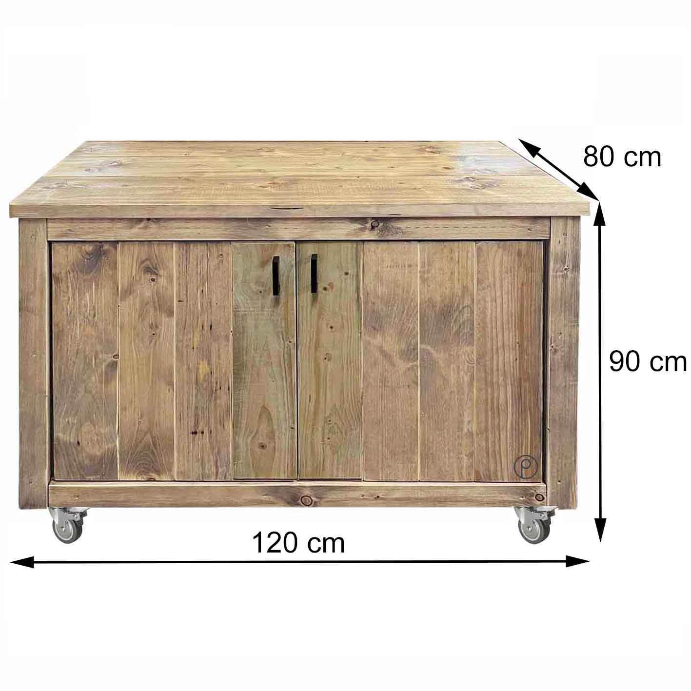 Die 4 cm starken Fichte/Kiefer Bohlen der Arbeitsfläche stehen für die massive Bauart. Reichlich Stauraum findet sich auch hinter der Türe, geteilt durch einen mittig montierten Fachboden. 4 Schwerlast-Rollen (2 davon mit Stopp-Funktion) machen diesen Tisch gleichzeitig auch zu einem flexiblen Möbelstück, das mühelos den perfekten Standort findet