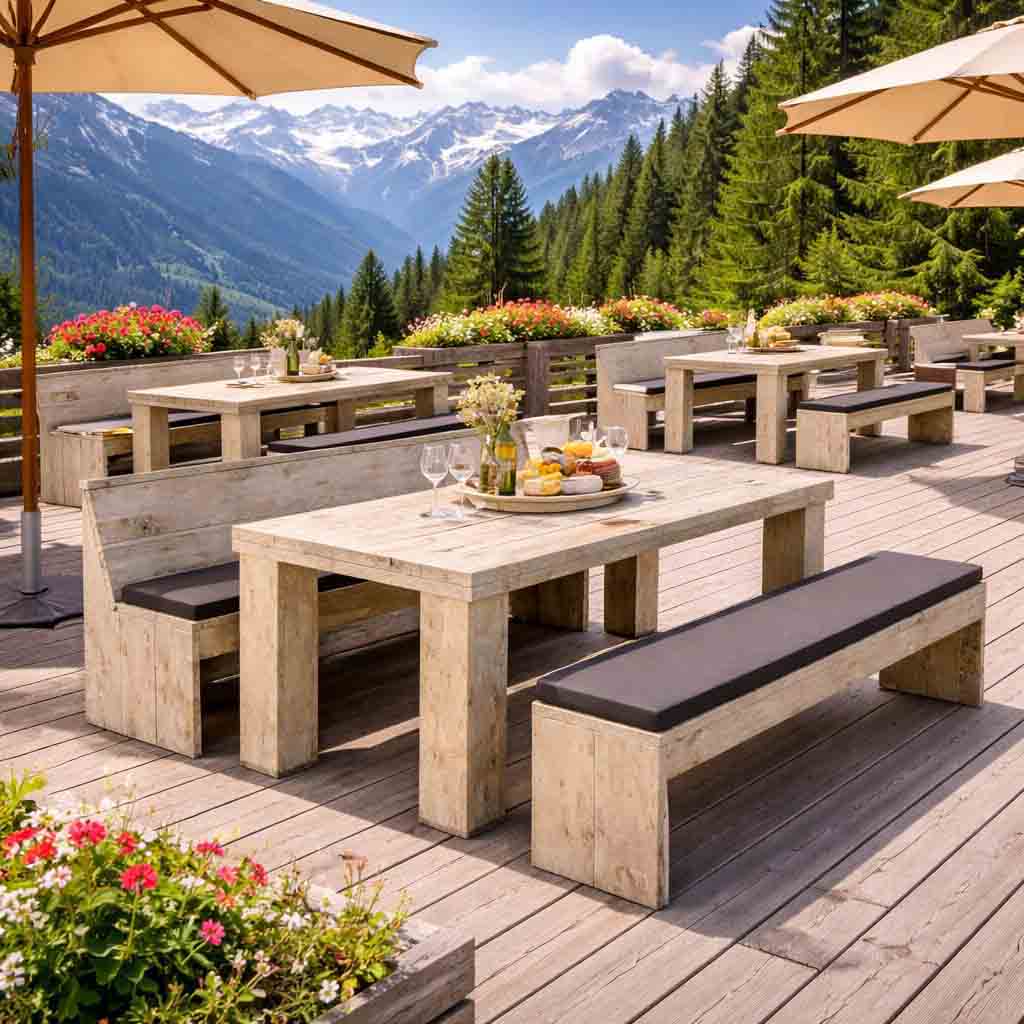 Die RICCIONE Esstisch-Garnitur steht für hochwertige Handwerkskunst, massive Bauholzqualität und zeitloses Outdoor-Design. Sie verwandelt jeden Garten- und Terrassenbereich in einen stilvollen Essplatz und bietet mit ihrer stabilen, wetterfesten Konstruktion sowohl für private Haushalte als auch für die Gastronomie die ideale Outdoor-Sitzlösung.