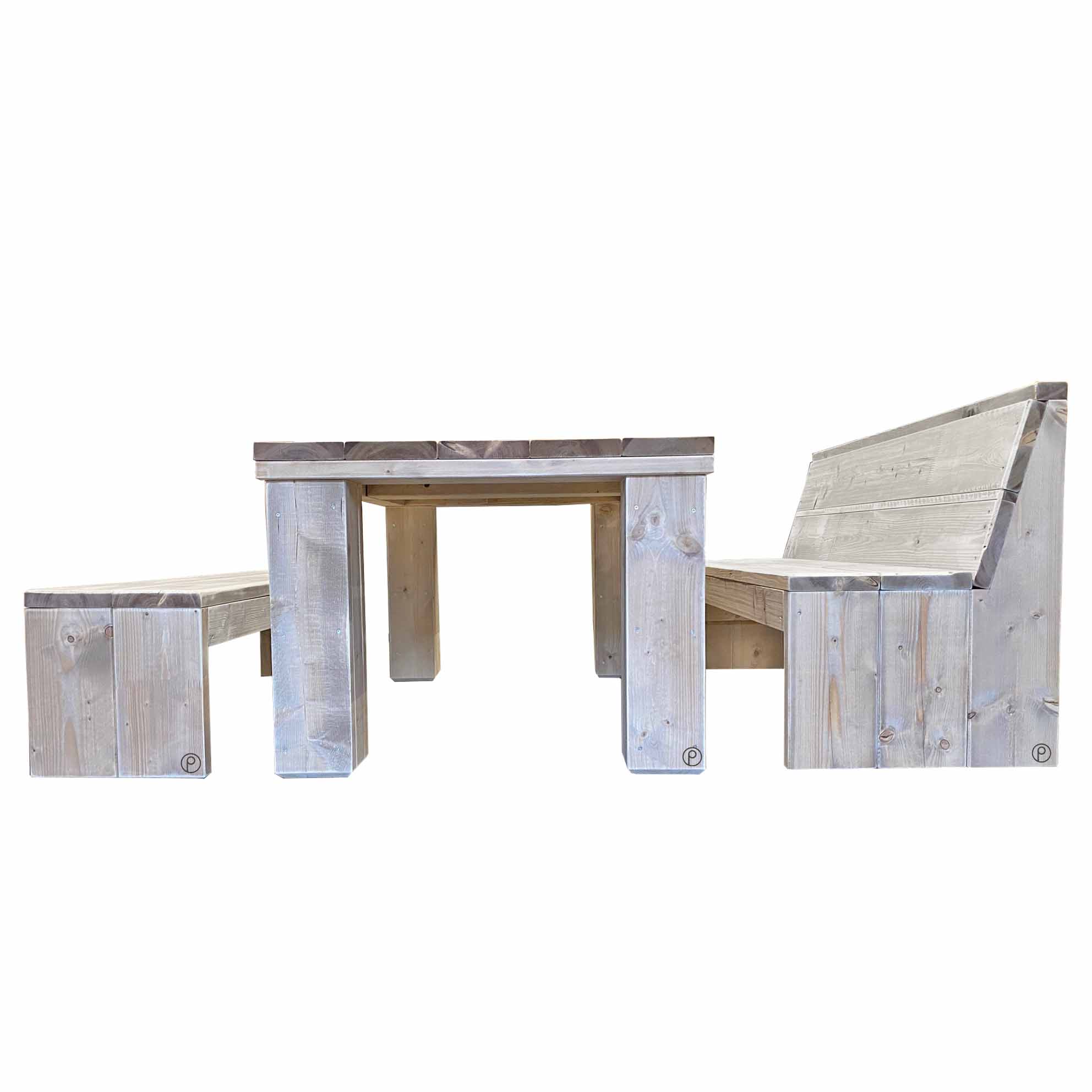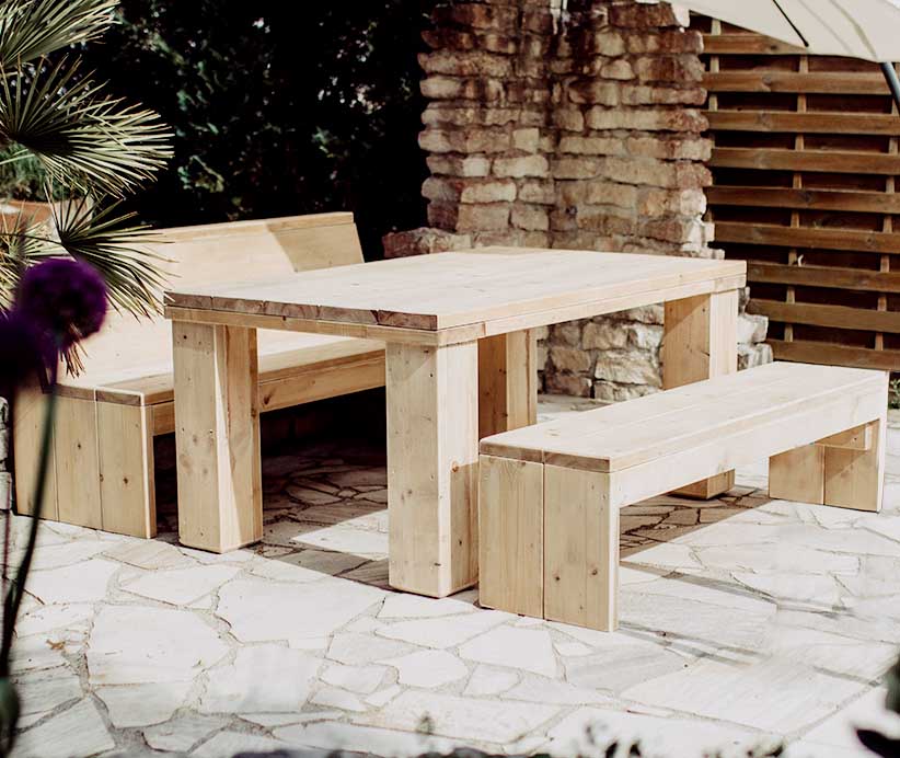 Bauholz Möbel: Esstisch mit 2 Bänken aus Neuholz in typischem Bauholz Design