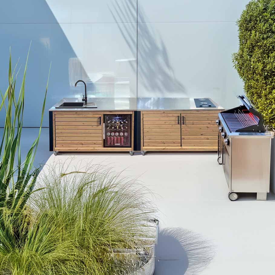 Die hochwertige Outdoorküche aus massivem Lärchenholz vereint natürliche Optik, extreme Widerstandsfähigkeit und professionelle Funktionalität, eignet sich als Grilltisch, BBQ Station oder modulare Outdoor Küche und überzeugt durch wetterfestes Holz mit natürlicher Dauerhaftigkeit, stabile Konstruktion, langlebige Verarbeitung sowie moderne Edelstahl-Arbeitsfläche für hygienisches und hitzebeständiges Arbeiten im Außenbereich.Funktionale Ausstattung und modulare Erweiterbarkeit