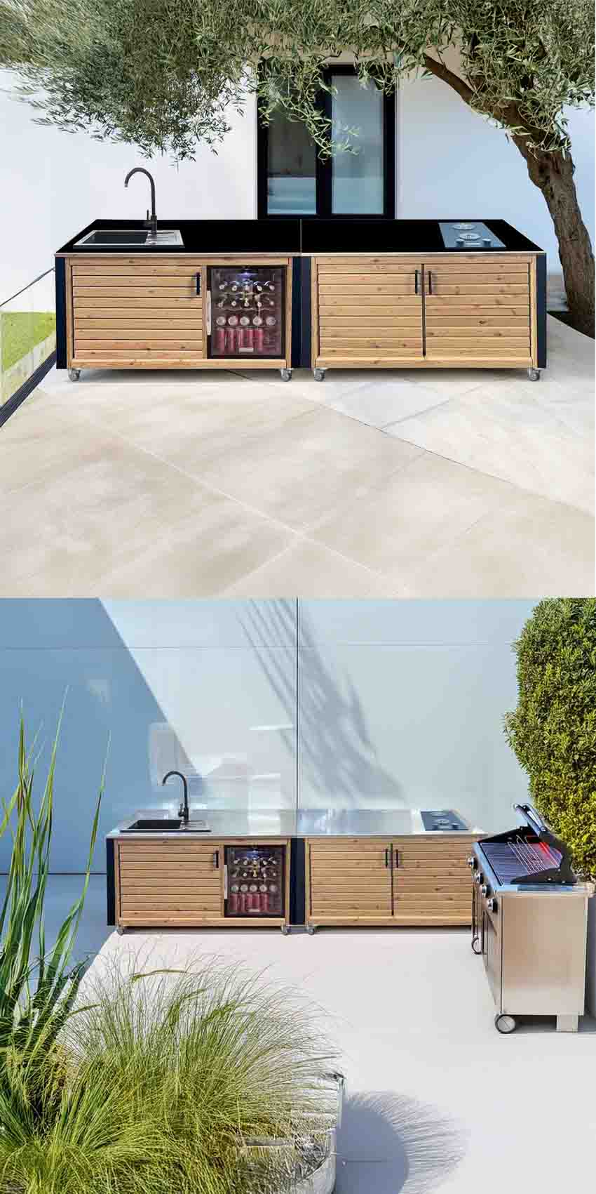 Die modulare Bauweise erlaubt eine individuelle Anpassung an Ihren Außenbereich. Ob kompakte Küchenzeilen, elegante Inseln oder erweiterbare L-förmige Küchenlösungen – gestalten Sie Ihre persönliche Outdoor-Küche nach Ihren Bedürfnissen.Ästhetik trifft Funktionalität