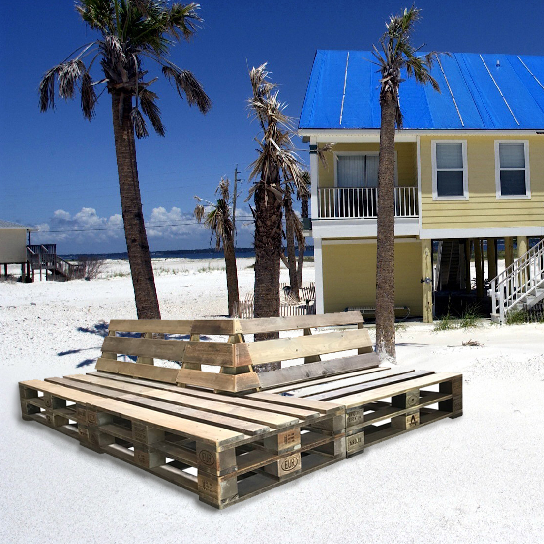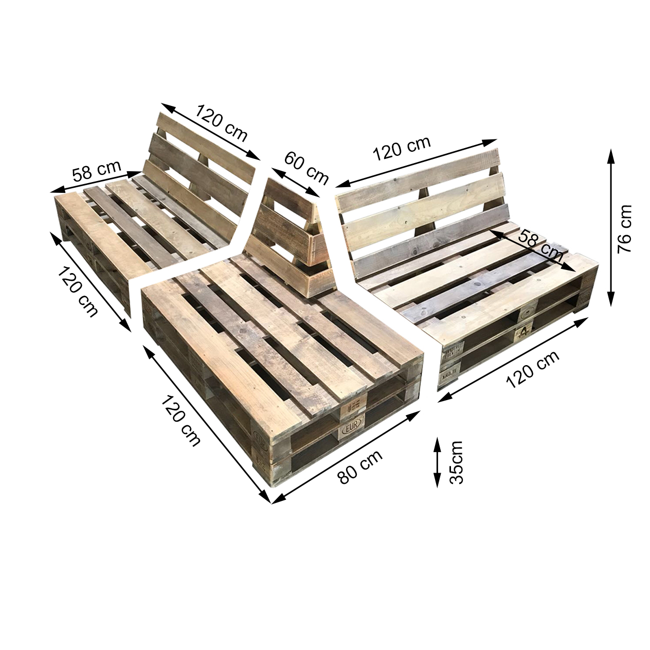 Neuholz im typischen Paletten Look vintage gebeizt, Wer nach einem qualitativ hochwertigem Palettensofa oder einer einzigartig verarbeiteten Palettenlounge sucht findet hier das passende Möbelstück für Indoor und Outdoor. Auch im Komplett-Set incl. Polster bestellbarDie pass-genauen Polster lassen wir in einem Deutschen Handwerksbetrieb fertigen was auch hier den Qualitäts-und Preisunterschied rechtfertigt.Polsterschaum: 10 cm stark RG 33/60, bezogen mit Polstervlies. Die Bezüge sind mit Reißverschluss versehen und abnehmbar 2 Bezugsstoffe stehen zur Wahl (siehe Farbkarten im Fotobereich)Microfaser "DENVER" - perfekt für den Indoor EinsatzMicrofaser "SORRENTO" - perfekt für den Outdoor Einsatzgewünschten Bezugsstoff / Farbe bitte im Bestellkommentar angebenLieferzeit Polster ca. 4-5 WochenMaße:Die einzelnen Module erlauben unterschiedliche Aufstellmaßez.B. Breite: 200 cmz.B. Tiefe: 200 cmHöhe: 76 cmSitzhöhe: 35 cmGewicht gesamt: 180 Kg Material:Neuholz Kiefer / Fichte, Standard Auslieferung in Vintage gebeizt gerne auch unbehandelt naturAuf Wunsch auch mit neutralen Klötzen ohne BrandingEigenschaften:Bestehend aus 3x 120cm Sofa & 2x 80 cm EckmodulJedes Element mit 4 Rollen (2 davon mit Feststellfunktion)Sitzhöhe erweiterbar auf 45 cm (siehe Zubehör)Optional: seitlicher Einschub Tisch Lieferzustand:Originalverpackt & NeuArtikel werden fertig montiert geliefert (Ausnahme: Rollen liegen transportbedingt bei)Dekorationen im Lieferumfang nicht enthalten Versand: Versandkosten (nach Volumen / Gewicht) sind im jeweiligen Warenkorb ersichtlich Versand auf Inseln und ins Ausland nur auf Anfrage