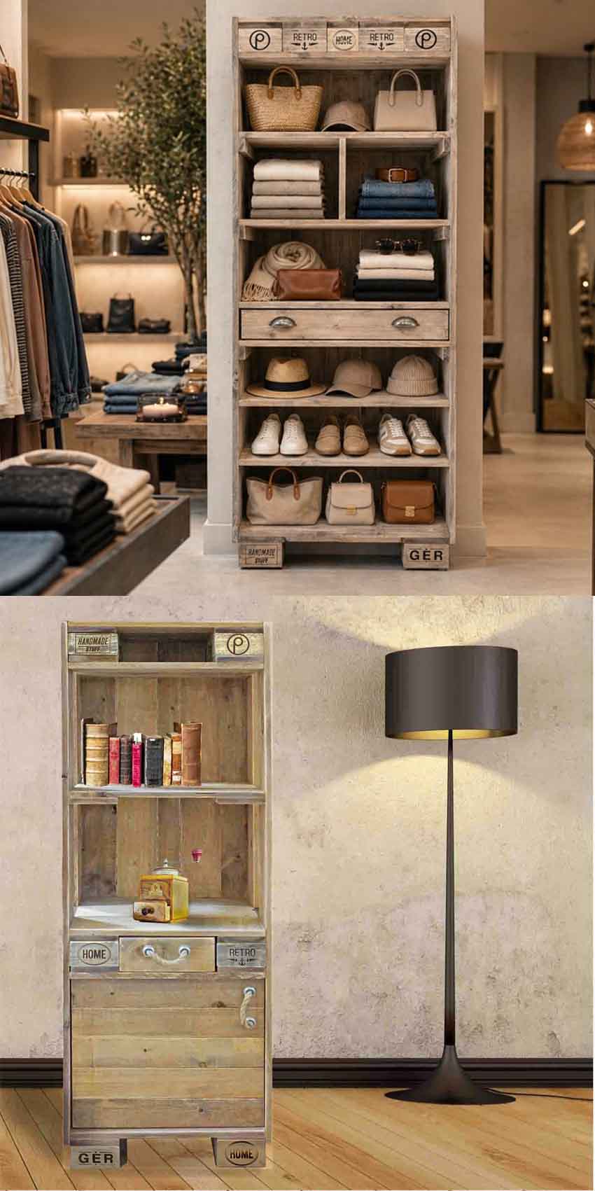 Palettenmöbel Hochschrank AINALOA LED Design & Funktion Moderner Hochschrank mit integrierter LED-Beleuchtung Stimmungsvoll beleuchtetes offenes Fach nach Wahl Elegantes, wohnliches Design Material & Verarbeitung Gefertigt aus hochwertigem Paletten Neuholz Nachhaltiges Upcycling-Handwerk Sorgfältige Handarbeit & robuste Konstruktion Stauraum & Einsatzbereich Großzügige Ablageflächen für Bücher, Dekoration & Geschirr Ideal für Produkt-/Warenpräsentation im Handel Einzigartige Holzstruktur mit individuellem Charakter Edles Highlight auch für Wohn- und Essbereiche Breite: 70 cm Tiefe: 50 cm Höhe: 183 cm (Maße, Gewicht und Farbgebung können materialbedingt minimal abweichen) Material: Neuholz Kiefer / Fichte, Auslieferung in Vintage gebeiztAuf Wunsch auch mit neutralen Klötzen ohne Branding Eigenschaften: 5 geräumige Ablagefächer 1 breites Schubfach mit Muschelgriff (ca 12 cm hoch) LED Beleuchtung mit FernbedienungSonderanfertigungen möglich Lieferzustand: Originalverpackt & Neu Artikel wird fertig montiert geliefert Dekorationen im Lieferumfang nicht enthaltenBatterien im Lieferumfang nicht enthalten Versand: Versandkosten (nach Volumen / Gewicht) sind im jeweiligen Warenkorb ersichtlich Versand auf Inseln und ins Ausland nur auf Anfrage