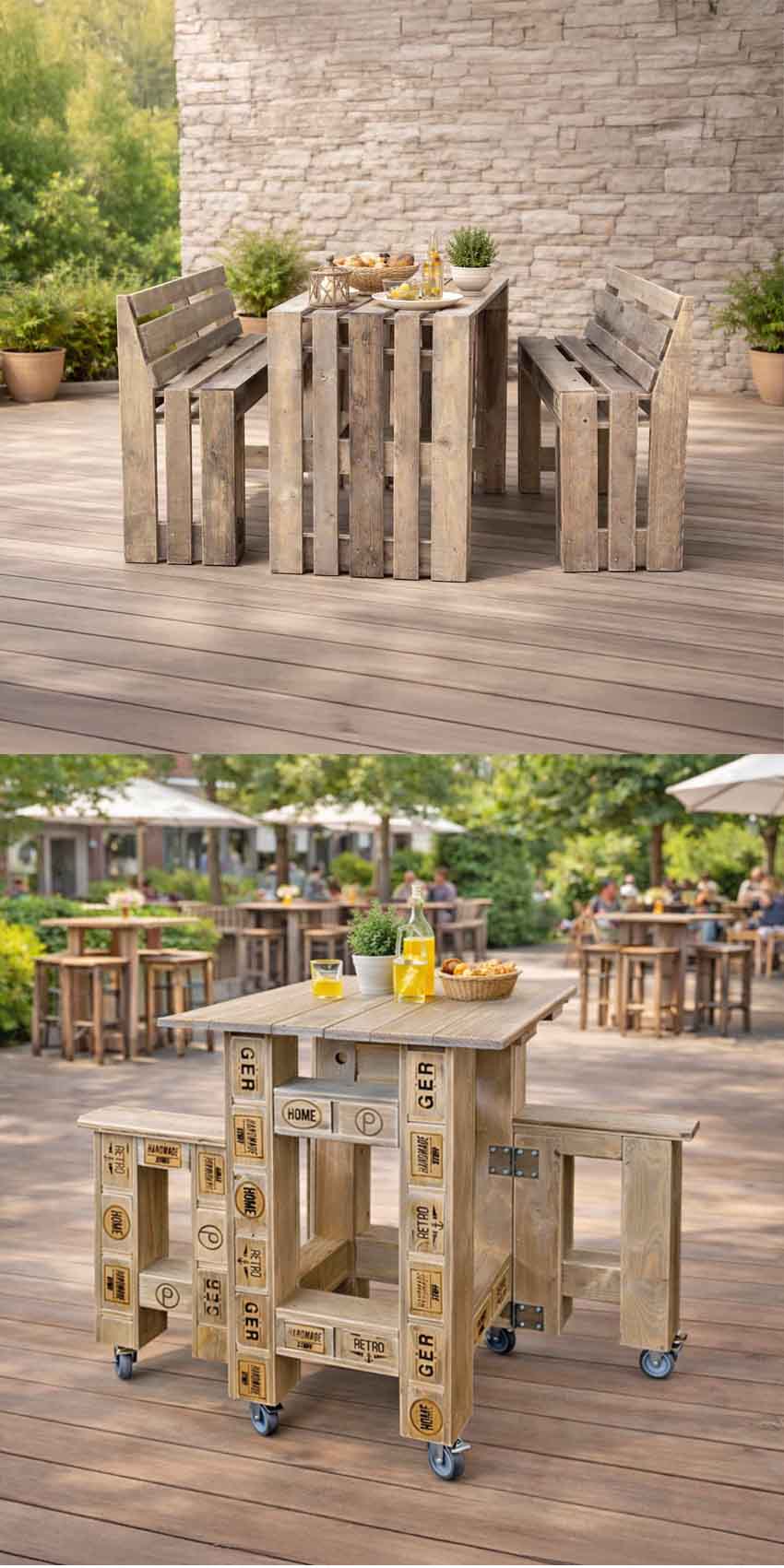 Palettenmöbel Tisch & Hocker-Set PELEKUNU – robuster Holz-Tisch mit Hockern Praktisches Tisch & Hocker-Set im Paletten-Look Das Tisch-Hocker-Set PELEKUNU verbindet praktisches Design, massives Holz und hochwertige Verarbeitung zu einem funktionalen Möbelensemble, das in jedem Raum überzeugt. Gefertigt aus robustem, sorgfältig verarbeitetem Paletten Neuholz bietet dieses Set eine langlebige und charmante Lösung für Innen- wie Außenbereiche.Durch seine kompakte Bauform eignet sich PELEKUNU ideal für kleinere Küchen, Balkone, Terrassen oder Essecken. Der massive Holztisch sorgt für Stabilität, während die ebenfalls stabil gebauten Hocker bequem verstaut werden können und eine natürliche, rustikale Optik verbreiten. Maße: Tisch: Breite: 100 cm Tiefe: 62 cm Höhe: 74 cm Gewicht: 25 Kg Hocker: Breite: 45 cm Tiefe: 45 cm Höhe: 47 cm Gewicht: 17 Kg Maße, Gewicht und Farbgebung können materialbedingt minimal abweichen Material: Neuholz Kiefer / Fichte, Standard Auslieferung in Vintage gebeiztGerne auch unbehandelt naturAuf Wunsch auch mit neutralen Klötzen ohne Branding Lieferzustand: Originalverpackt & Neu Artikel wird fertig montiert geliefert Dekorationen im Lieferumfang nicht enthaltenVersand: Versandkosten (nach Volumen / Gewicht) sind im jeweiligen Warenkorb ersichtlich Versand auf Inseln und ins Ausland nur auf Anfrage