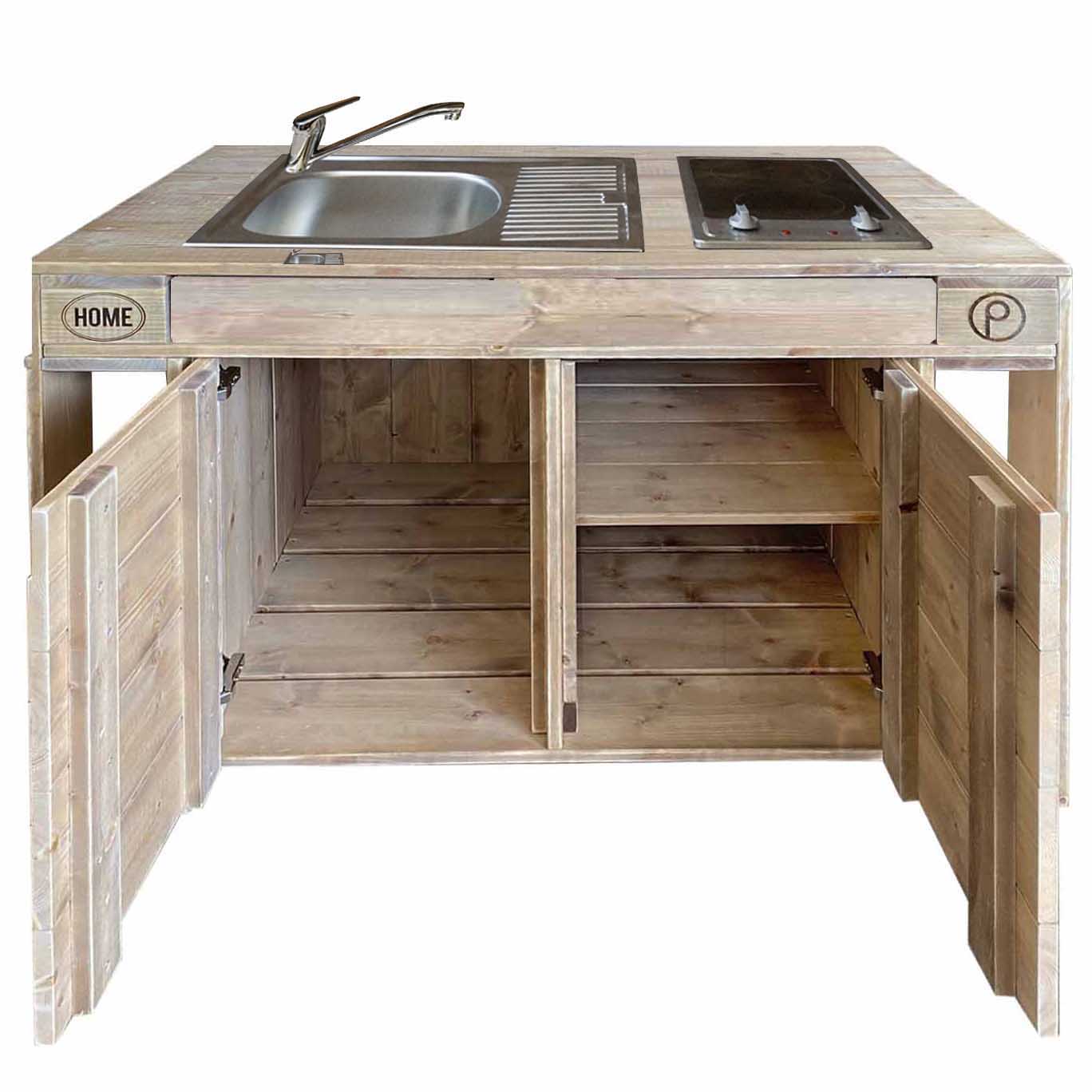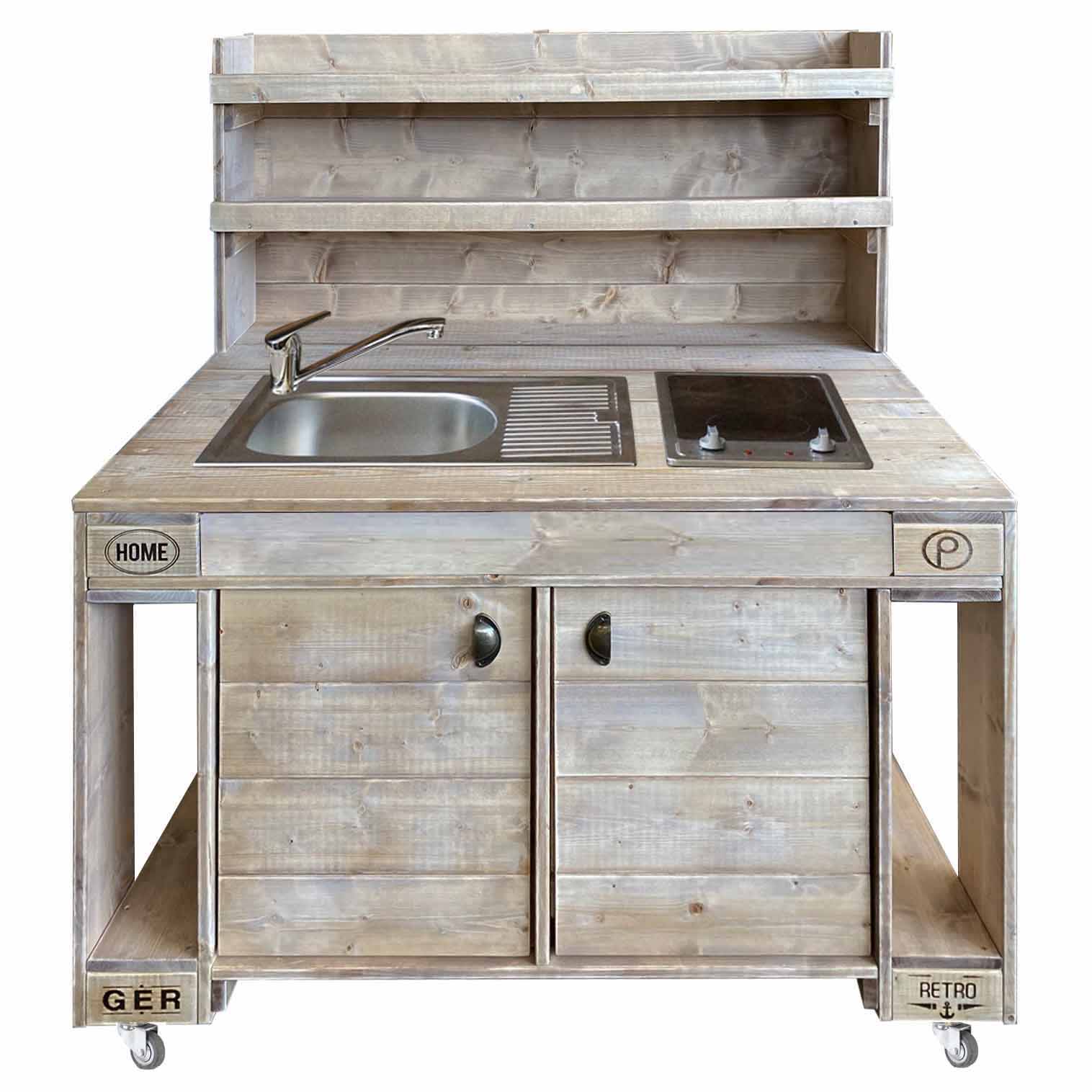 Grilltisch - Kochinsel - Grillwagen - Grill Servierwagen - Outdoorküche aus Neuholz in Paletten Optik, unsere Exclusiv Variante incl. Glaskeramik-Kochfeld, Einbauspüle mit Mischbatterie