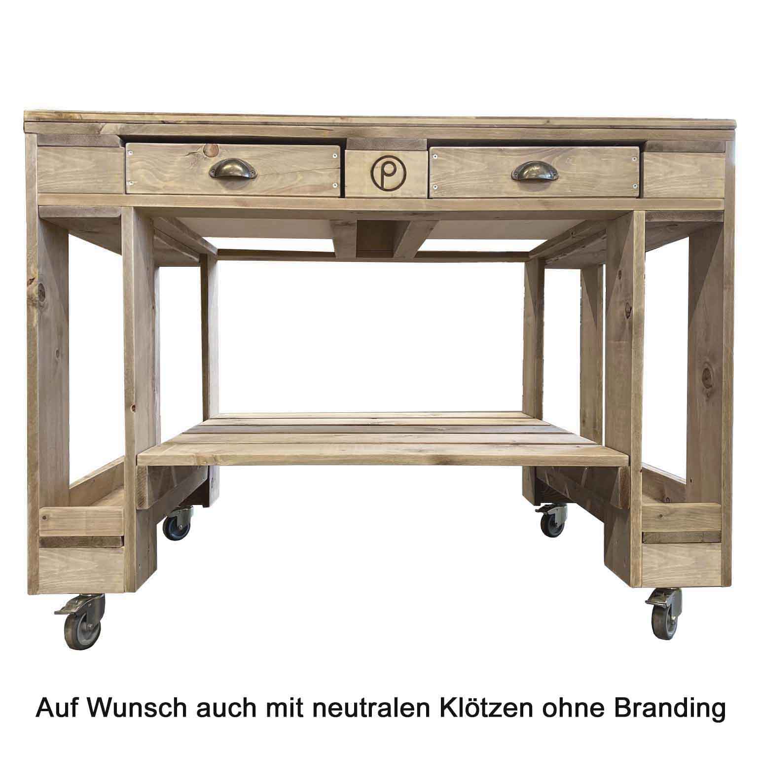 Die PERTHONE BASIC ist die kompakte, funktionale Outdoorküche im Palettenmöbel-Style und ideal für alle, die ein robustes und stilvolles BBQ-Möbel für Terrasse oder Garten suchen. Handgefertigt aus massivem, behandeltem Neuholz, kombiniert sie rustikalen Charme mit hoher Stabilität und Langlebigkeit. Mit ihrer praktischen Arbeits- und Ablagefläche eignet sich die PERTHONE BASIC perfekt für das Grillen, Zubereiten von Speisen oder als kleine Outdoor-Bar. Das Holz sorgt für ein natürliches, warmes Ambiente und macht jedes Möbelstück zu einem einzigartigen Unikat. Die PERTHONE BASIC kann dank ihres modularen Designs problemlos in bestehende PERTHONE Outdoorküchen integriert werden. Ob als Einzelstück oder kombiniert mit weiteren Modulen wie Spül-, Kühl- oder Eckmodulen – sie passt sich flexibel deinen Bedürfnissen an. Varianten: "BASIC" mit Holz Arbeitsfläche "BASIC" mit Edelstahl Arbeitsfläche "BASIC" mit Rückwand u. Holz Arbeitsfläche "BASIC" mit Rückwand u. Edelstahl Arbeitsfläche Maße: Breite: 120 cm Tiefe: 80 cm Höhe: 91 cm (incl. Rollen) Rückwandregal: T 22 cm x H 50 cmMaße, Gewicht und Farbgebung können materialbedingt minimal abweichen Material: Neuholz Kiefer / Fichte, Standard Auslieferung in Vintage gebeizt Gerne auch unbehandelt naturAuf Wunsch auch mit neutralen Klötzen ohne Branding Eigenschaften: Massiv gebauter Grilltisch / Grillwagen 1 mittiger Fachboden (83 x 80 cm) seitlich je 1 Abstellfach 2 Schubladen mit Muschelgriff 1 Edelstahl Doppelhakenleiste 4 Schwerlastrollen (davon 2 mit Feststeller) OPTIONAL: passgenaue Abdeckhaube (siehe Zubehör) Lieferzustand: Originalverpackt & Neu Artikel wird fertig montiert geliefert (Ausnahme: Rollen und Doppelhakenleiste) Dekorationen im Lieferumfang nicht enthalten Versand: Versandkosten (nach Volumen / Gewicht) sind im jeweiligen Warenkorb ersichtlich Versand auf Inseln und ins Ausland nur auf Anfrage