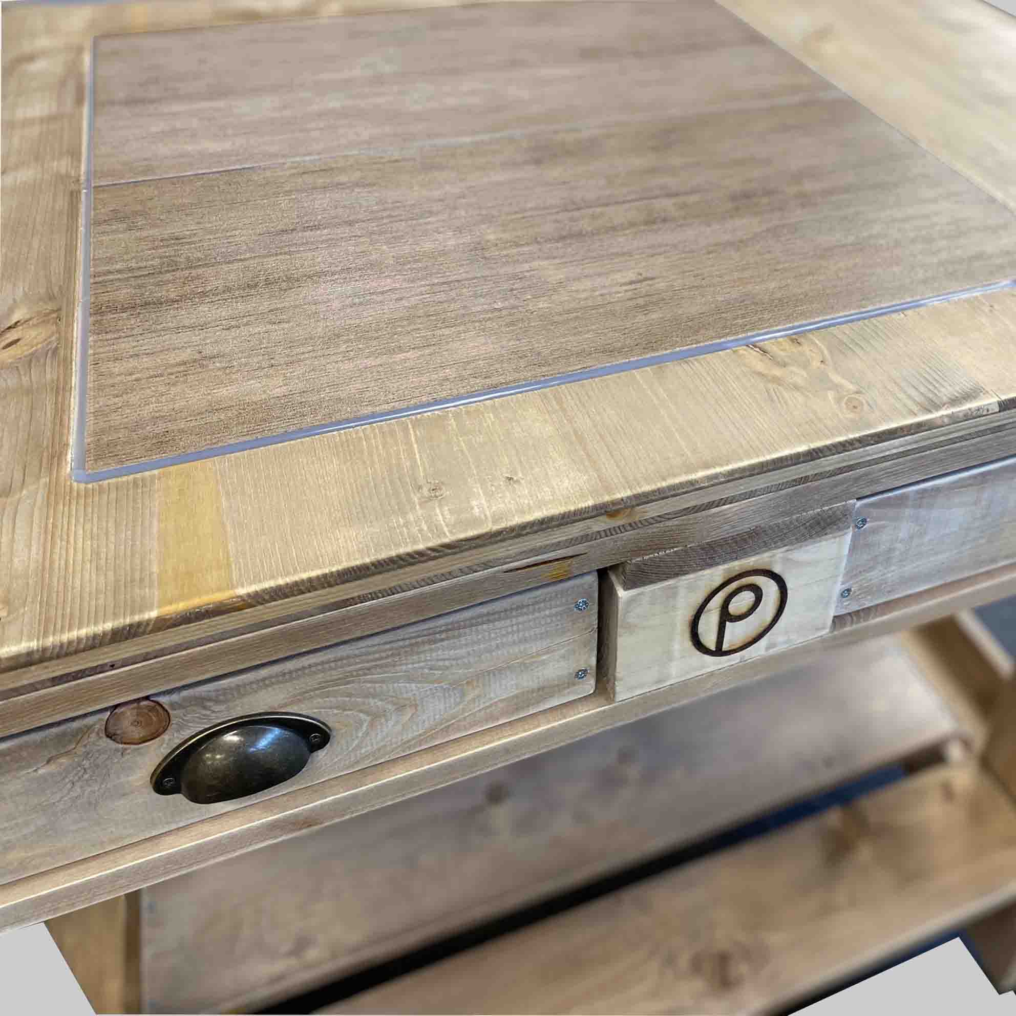 - Tischplatte: 3-Schichten Tischlerplatte mit Bootslack eingelassen
