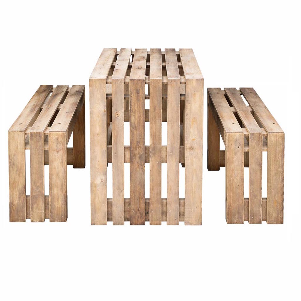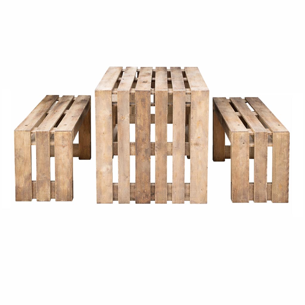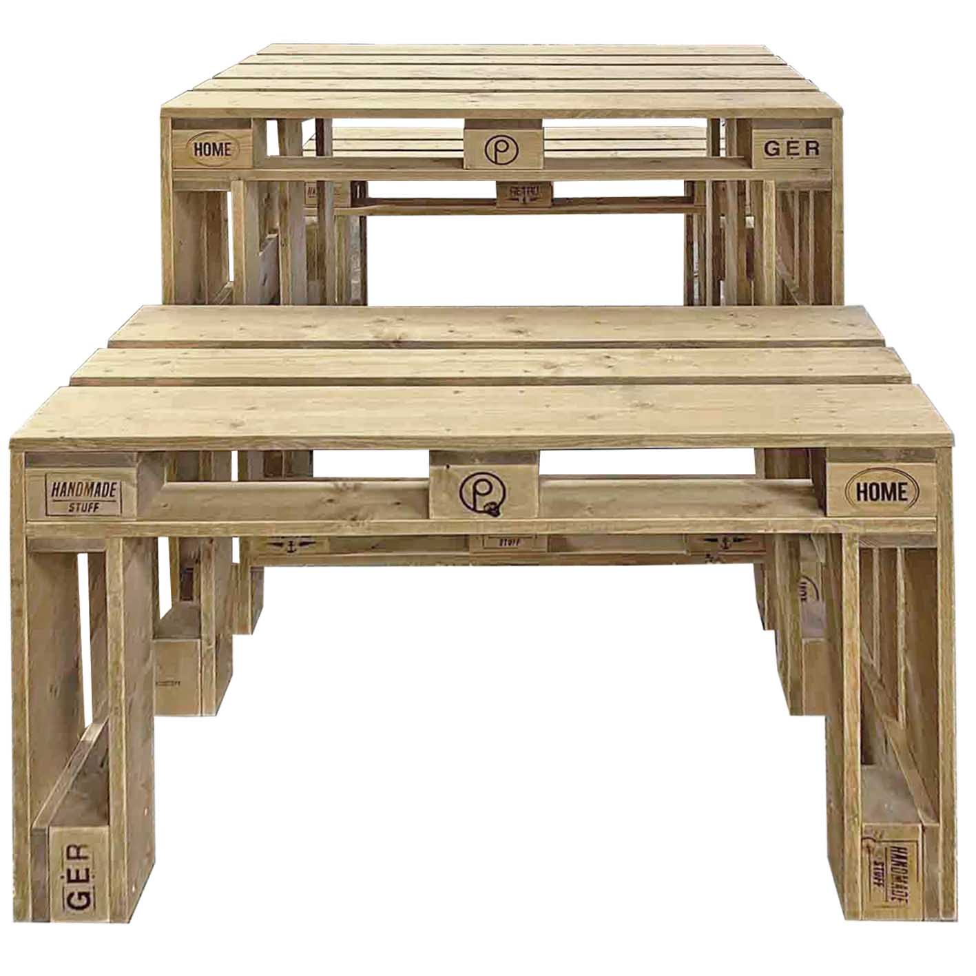 Palettenmöbel Esstisch-Garnitur / Lounge-Garten-Garnitur PORTOFINO Moderne Palettenmöbel Garten- und Lounge-Garnitur Die PORTOFINO Palettenmöbel-Garnitur vereint modernes Design, natürlichen Holzcharakter und langlebige Qualität zu einer stilvollen Sitzgruppe für deinen Außenbereich. Das Set umfasst einen robusten Esstisch und perfekt abgestimmte Sitzmöbel, die sowohl optisch als auch funktional überzeugen.Gefertigt aus massivem Paletten Neuholz bringt PORTOFINO ein warmes, gemütliches Lounge-Ambiente in Garten, Terrasse oder Kantine. Ob für gemeinsame Mahlzeiten, entspannte Abende oder gesellige Runden – diese Garnitur ist ein echter Blickfang und sorgt für ein einladendes Wohlfühlgefühl.bestehend aus:2x Sitzbank 1x Esstisch Maße: Tisch: Breite: 120-140-160-180-200 cm Tiefe: 80 cm Höhe: 75 cm Gewicht: 20 - 43 Kg Sitzbank: Breite: 120 - 200 cm Tiefe: 47 cm Sitzhöhe: 45 cm Gewicht: 15-25 Kg (Maße, Gewicht und Farbgebung können materialbedingt minimal abweichen) Material: Neuholz Kiefer / Fichte, Standard Auslieferung in Vintage gebeiztGerne auch unbehandelt naturAuf Wunsch auch mit neutralen Klötzen ohne Branding Lieferzustand: Originalverpackt & Neu Artikel werden fertig montiert geliefert Dekorationen im Lieferumfang nicht enthalten Versand: Versandkosten (nach Volumen / Gewicht) sind im jeweiligen Warenkorb ersichtlich Versand auf Inseln und ins Ausland nur auf Anfrage