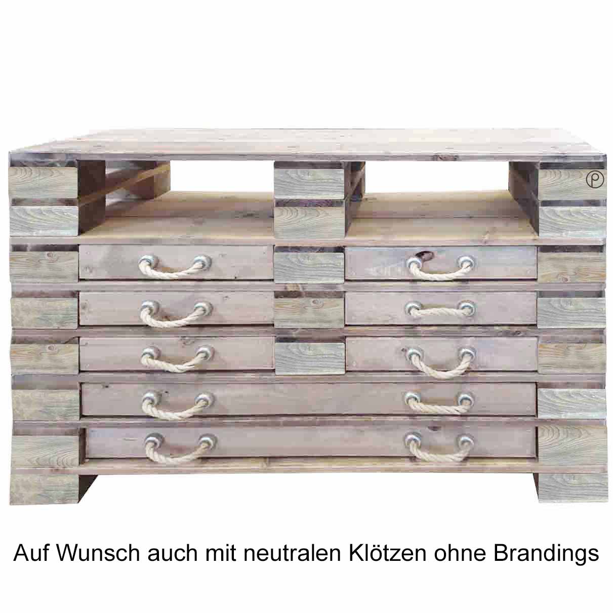 Palettenmöbel - Sehr aufwendig und massiv gebaute Kommode / Highboard aus Neuholz gefertigt im typischen Paletten Design. Maße: Breite: 120 cm Tiefe: 40 cm Höhe: 96 cm Gewicht: 74 Kg Maße, Gewicht und Farbgebung können materialbedingt minimal abweichen Material: Neuholz Kiefer / Fichte, Standard Auslieferung in Vintage gebeiztunbehandelt natur gerne auf Anfrage)Auf Wunsch auch mit neutralen Klötzen ohne Branding Eigenschaften: Massiv gebautes Highboard mit 36 verbauten Vollholzklötzen 2-teilige Lieferung ermöglicht variable Aufstellung Set bestehend aus 2 Teilen und kann nach Wunsch gestapelt werden 4 große, 2 kleine Schubfächer mit Seilgriffen (Innenmaß groß 86 cm, klein 34cm) 3 Front-Ablagen, seitlich je 8 Ablagefächer Lieferzustand: Originalverpackt & Neu Artikel wird fertig montiert geliefert Dekorationen im Lieferumfang nicht enthalten Versand:Versandkosten (nach Volumen / Gewicht) sind im jeweiligen Warenkorb ersichtlichVersand auf Inseln und ins Ausland nur auf Anfrage