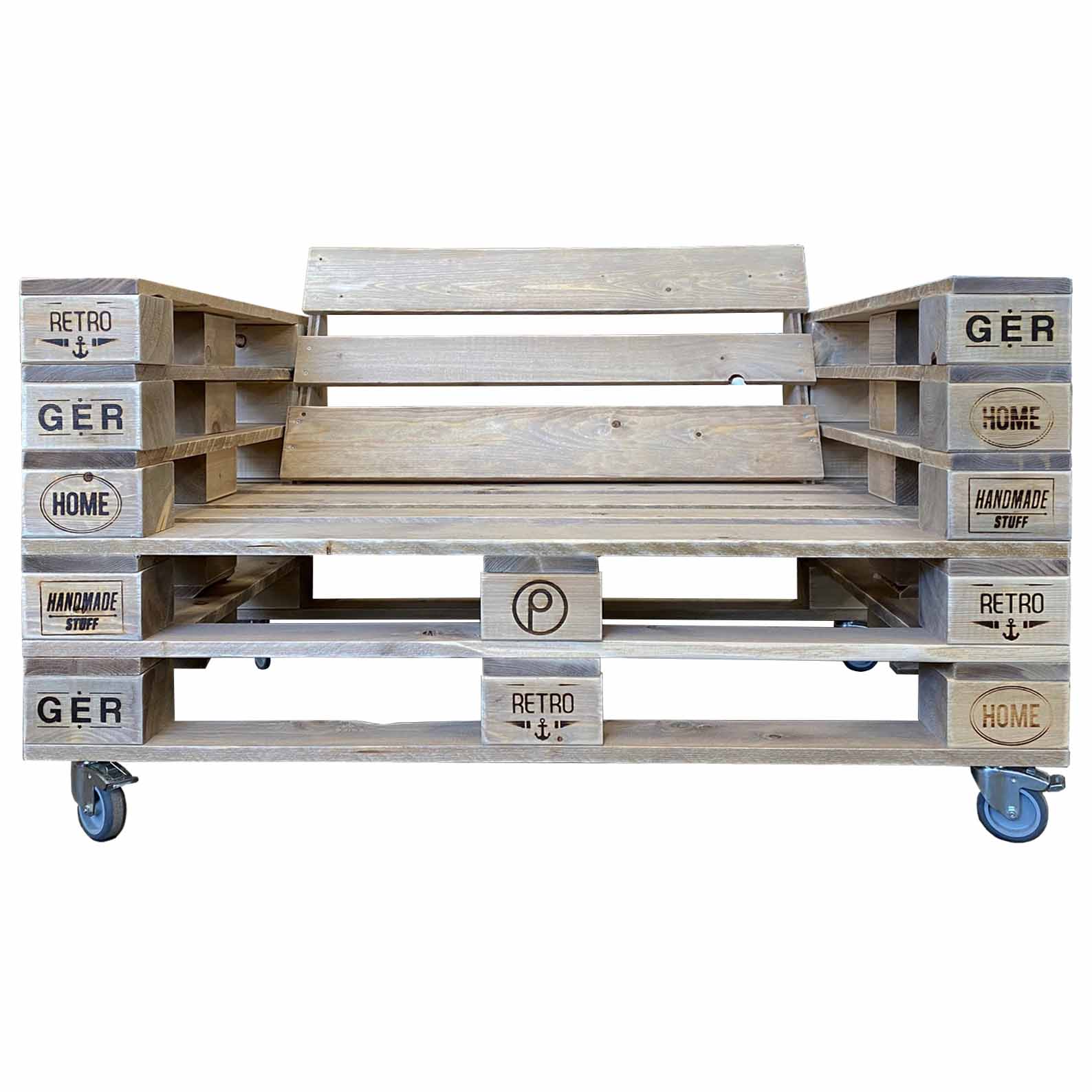 Neuholz im typischen Paletten Look vintage gebeizt, Wer nach einem qualitativ hochwertigem Palettensofa oder einer einzigartig verarbeiteten Palettenlounge sucht findet hier das passende Möbelstück für Indoor und Outdoor. Auch im Komplett-Set incl. Polster bestellbarDie pass-genauen Polster lassen wir in einem Deutschen Handwerksbetrieb fertigen was auch hier den Qualitäts-und Preisunterschied rechtfertigt.Polsterschaum: 10 cm stark RG 33/60, bezogen mit Polstervlies. Die Bezüge sind mit Reißverschluss versehen und abnehmbar 2 Bezugsstoffe stehen zur Wahl (siehe Farbkarten im Fotobereich)Microfaser "DENVER" - perfekt für den Indoor EinsatzMicrofaser "SORRENTO" - perfekt für den Outdoor Einsatzgewünschten Bezugsstoff / Farbe bitte im Bestellkommentar angebenLieferzeit Polster ca. 4-5 WochenMaße:Die einzelnen Module erlauben unterschiedliche Aufstellmaßez.B. Breite: 200 cmz.B. Tiefe: 200 cmHöhe: 76 cmSitzhöhe: 35 cmGewicht gesamt: 180 Kg Material:Neuholz Kiefer / Fichte, Standard Auslieferung in Vintage gebeizt gerne auch unbehandelt naturAuf Wunsch auch mit neutralen Klötzen ohne BrandingEigenschaften:Bestehend aus 3x 120cm Sofa & 2x 80 cm EckmodulJedes Element mit 4 Rollen (2 davon mit Feststellfunktion)Sitzhöhe erweiterbar auf 45 cm (siehe Zubehör)Optional: seitlicher Einschub Tisch Lieferzustand:Originalverpackt & NeuArtikel werden fertig montiert geliefert (Ausnahme: Rollen liegen transportbedingt bei)Dekorationen im Lieferumfang nicht enthalten Versand: Versandkosten (nach Volumen / Gewicht) sind im jeweiligen Warenkorb ersichtlich Versand auf Inseln und ins Ausland nur auf Anfrage