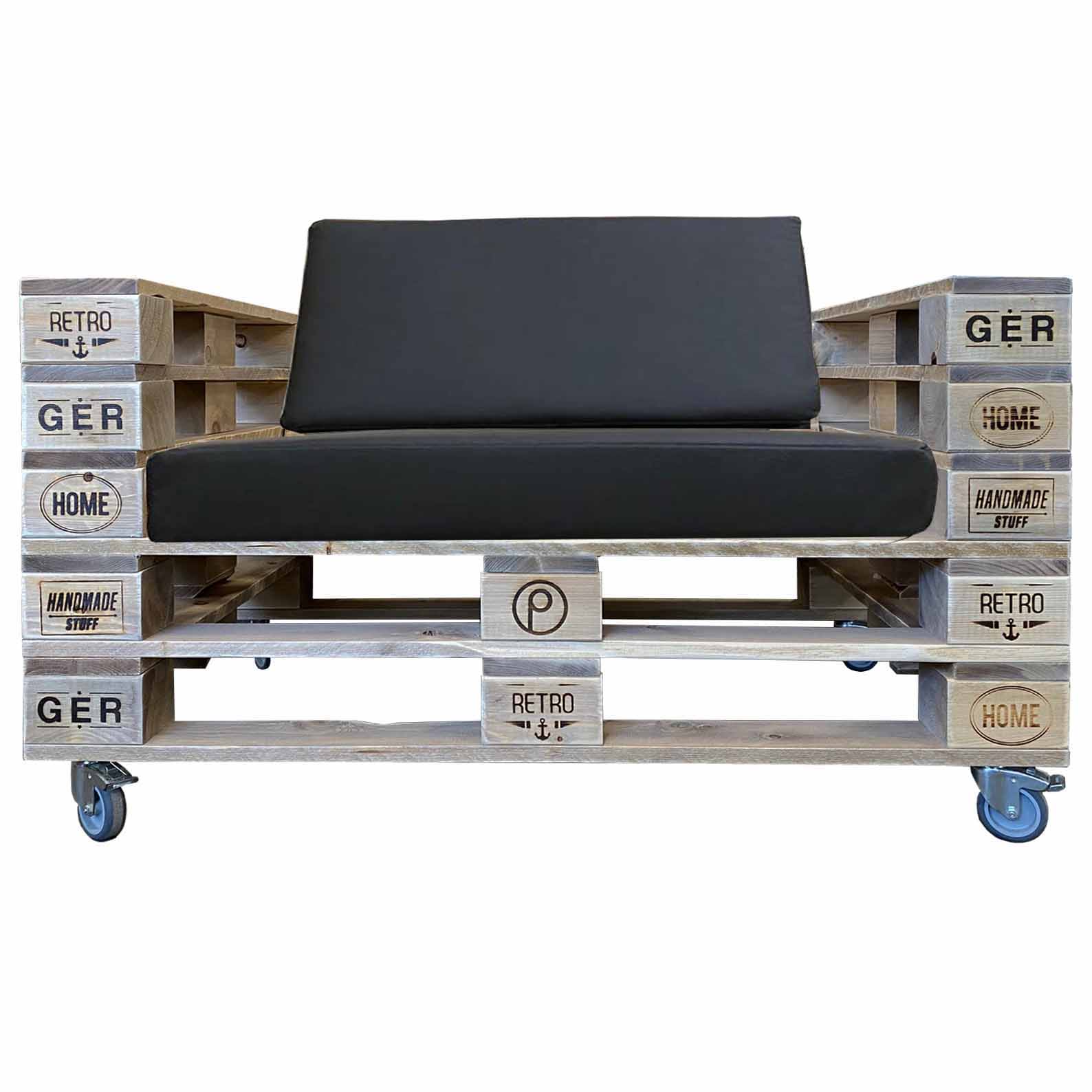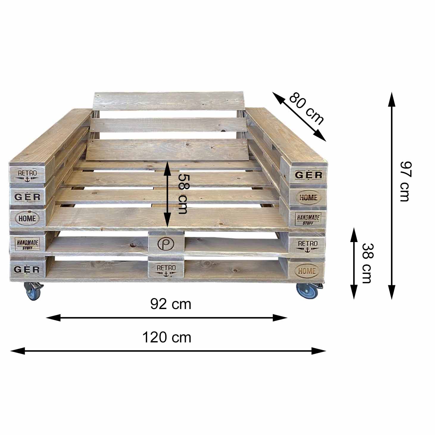 Palettenmöbel: platzsparende Lounge Kombination / Paletten Sofa aus Neuholz in typischer Paletten Optik gefertigt. Auch im Komplett-Set incl. Polster bestellbar Die pass-genauen Polster lassen wir in einem Deutschen Handwerksbetrieb fertigen was auch hier den Qualitäts-und Preisunterschied rechtfertigt. Polsterschaum: 10 cm stark RG 33/60, bezogen mit Polstervlies. Die Bezüge sind mit Reißverschluss versehen und abnehmbar2 Bezugsstoffe stehen zur Wahl: (siehe Farbkarten im Fotobereich)Microfaser „DENVER“ - perfekt für den Indoor EinsatzMicrofaser „SORRENTO“ – perfekt für den Outdoor EinsatzGewünschte Polsterfarbe im Bestellkommentar angeben Maße:Die einzelnen Module erlauben unterschiedliche AufstellmaßeBreite: 160 cmTiefe: 80 cmHöhe: 76 cmSitzhöhe: 35 cmSitztiefe: 58 cmGewicht gesamt: 64 KgMaterial:Neuholz Kiefer / Fichte, Standard Auslieferung in Vintage gebeizt gerne auch unbehandelt naturAuf Wunsch auch mit neutralen Klötzen ohne BrandingEigenschaften:Bestehend aus 2x 80 cm EckmodulJedes Element mit 4 Rollen (2 davon mit Feststellfunktion)Sitzhöhe erweiterbar auf 45 cm (siehe Zubehör)Lieferzustand:Originalverpackt & NeuArtikel werden fertig montiert geliefert (Ausnahme: Rollen liegen transportbedingt bei)Dekorationen im Lieferumfang nicht enthalten Passgenaue Abdeckhaube auf Anfrage Versand: Versandkosten (nach Volumen / Gewicht) sind im jeweiligen Warenkorb ersichtlich Versand auf Inseln und ins Ausland nur auf Anfrage
