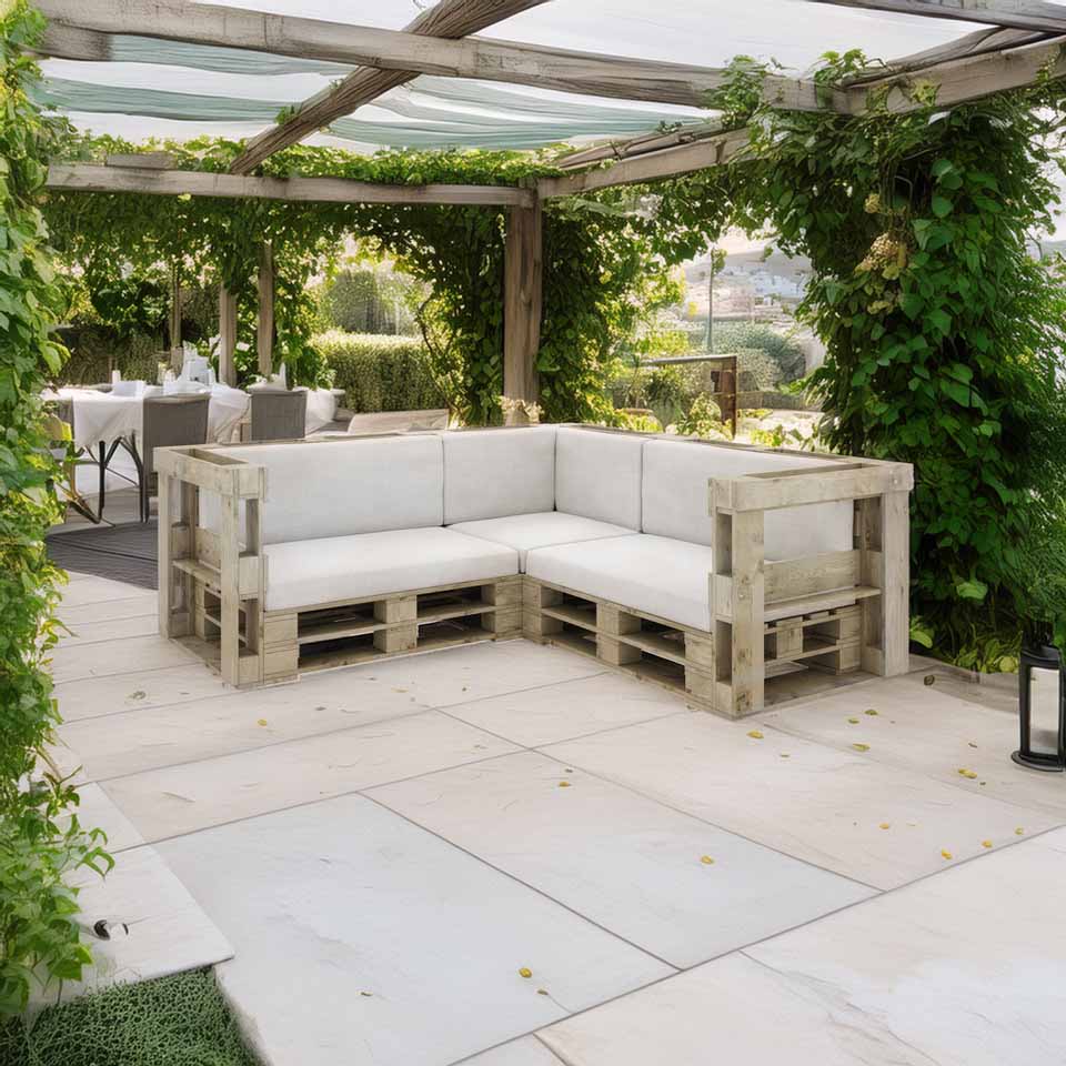 Durch die modulare Bauweise lassen sich die einzelnen Elemente flexibel anordnen – von klassischer Eck-Lounge bis hin zur offenen Sitzgruppe. Ob Terrasse, Balkon, Garten, Wintergarten oder Gastronomie: Diese Palettenmöbel-Kombination schafft überall ein gemütliches, entspanntes Ambiente.