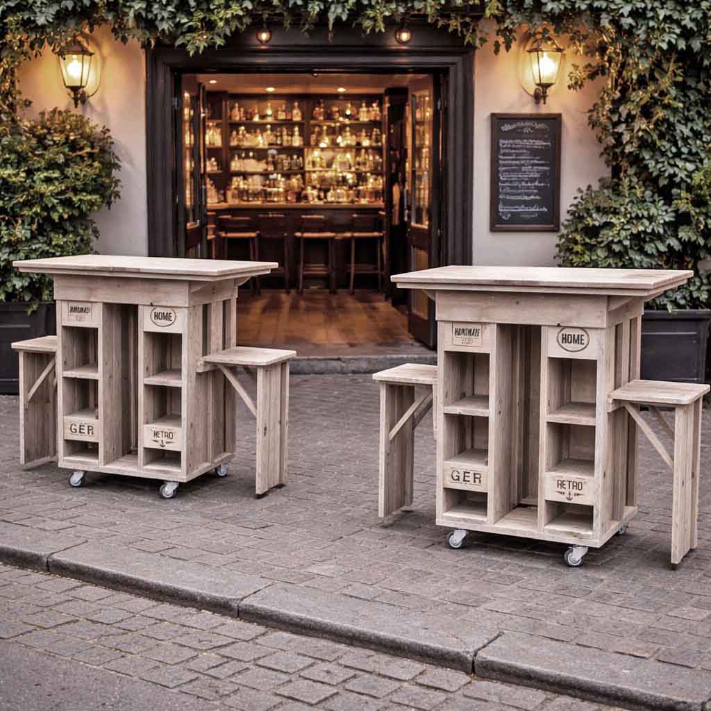 Palettenmöbel Gastro Stehtisch ‑ Sitz Kombination MADAGASKAR Plus Innovative Stehtisch‑ und Sitzlösung für Gastronomie & Outdoorbereiche Die MADAGASKAR Plus Stehtisch-Sitz Kombination ist die perfekte Wahl für Gastronomie, Events und Outdoor-Bereiche, in denen hohe Stabilität, langlebige Materialien und platzsparendes Design gefragt sind. Dieses Set kombiniert einen massiven Stehtisch mit integrierten Sitzmöglichkeiten – ideal für Biergärten, Bars, Foodtrucks, Terrassen oder Eventflächen.Dank der massiven Holzbauweise und der robusten Palettenmöbel Konstruktion bietet MADAGASKAR Plus optimale Standfestigkeit und ein modernes, rustikales Erscheinungsbild, das Atmosphäre schafft und Gäste zum Verweilen einlädt. Maße: Breite = 80cmHöhe = 111cmTiefe = 80cm Gewicht: 50kg Belastbarkeit gesamt: 130kg Belastbarkeit Sitz: 80kgMaße und Gewicht können materialbedingt leicht abweichen Material: Neuholz Kiefer / Fichte, Standard Auslieferung in Vintage gebeizt Unbehandelt natur gerne auf Anfrage)Auf Wusch auch mit neutralen Klötzen ohne BrandingLieferzustand:Originalverpackt & NeuArtikel wird fertig montiert geliefert (Ausnahme: Rollen liegen transportbedingt bei)Deko-Artikel im Lieferumfang nicht enthalten Versand: Versandkosten (nach Volumen / Gewicht) sind im jeweiligen Warenkorb ersichtlich Versand auf Inseln und ins Ausland nur auf Anfrage