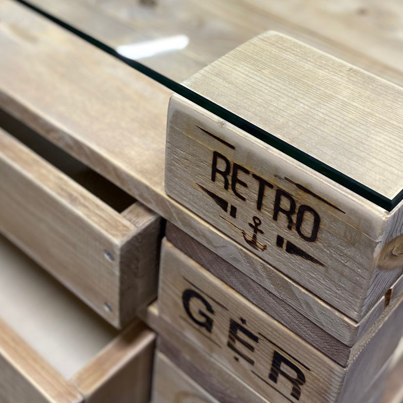massiver Couchtisch, Beistelltisch, Wohnzimmertisch, vintage gebeizt im typischen Europaletten Design Maße: Breite: 70 cm Tiefe: 40 cm Höhe: 54 cm Gewicht: 29 KgMaße, Gewicht und Farbgebung können materialbedingt minimal abweichen Material: Neuholz Kiefer / Fichte, Standard Auslieferung in Vintage gebeizt gerne auch unbehandel natur Auf Wunsch auch mit neutralen Klötzen ohne Branding Eigenschaften: verbaut mit 16 Europaletten-Klötzen 3 Schubfächer (durchgängig nach beiden Seiten zu öffnen) je 2 seitliche Ablage-Fächer 4 Lenkrollen (davon 2 mit Feststellfunktion) max. Belastbarkeit: 80 kg Lieferzustand: Originalverpackt & Neu Artikel wird fertig montiert geliefert ( Ausnahme: Rollen liegen transportbedingt bei ) Dekorationen im Lieferumfang nicht enthalten Versand: Versandkosten (nach Volumen / Gewicht) sind im jeweiligen Warenkorb ersichtlich Versand auf Inseln und ins Ausland nur auf Anfrage