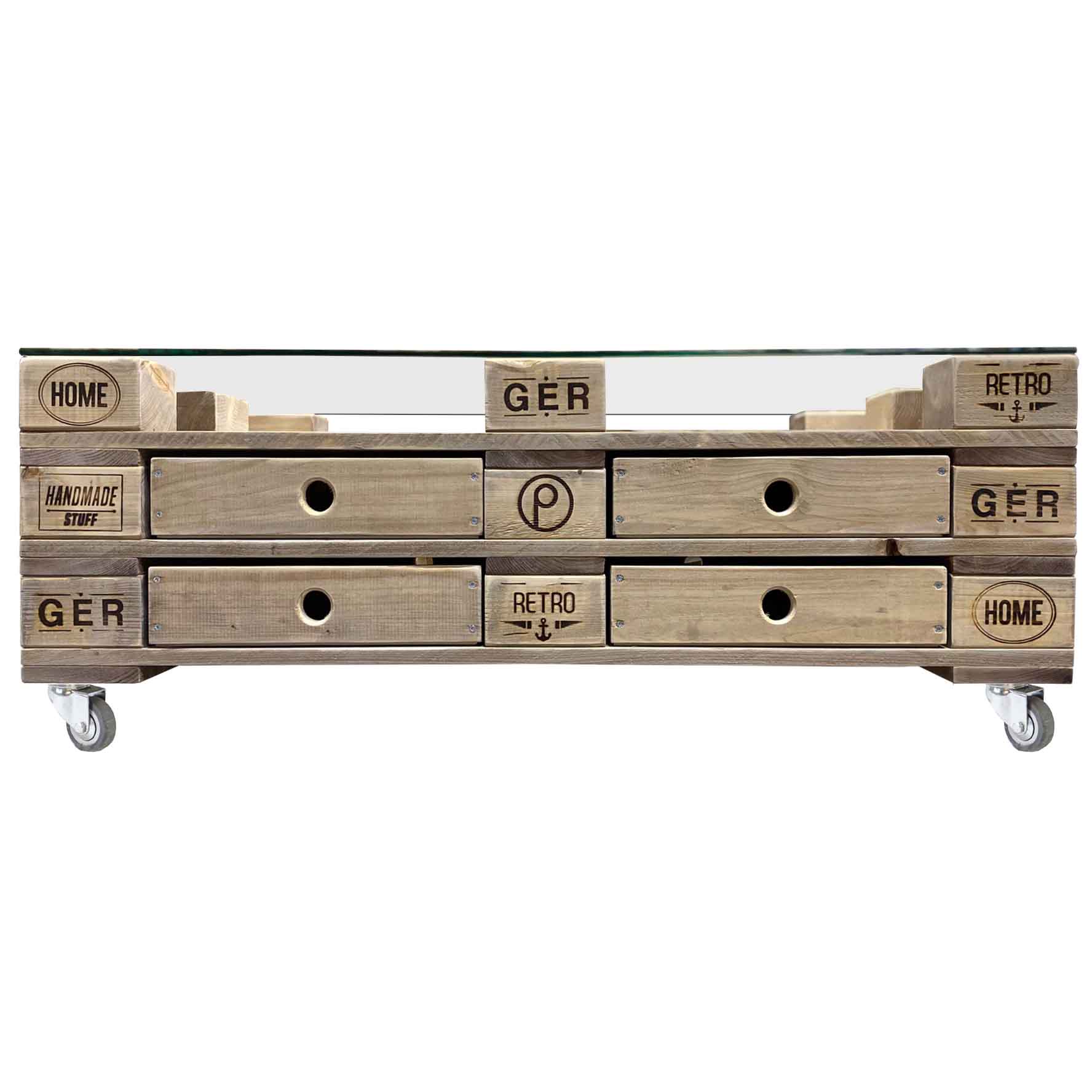 Palettenmöbel: Wohnzimmertisch, Couchtisch - massiver, großer Tisch aus Neuholz mit Glasplatte im typischen Paletten Design.