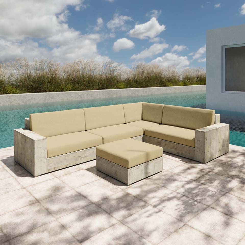 Bauholz Möbel: Diese Eck-Lounge im Bauholz Stil fällt durch ihre massive und hochwertige Optik auf. Für das klassische Bauholz Design wird Fichte/Kiefer Neuholz verwendet das in traditioneller Handwerkskunst verarbeitet wird. Diese Bauholz-Lounge ist in nahezu allen Maßen lieferbar, die von uns zur Verfügung gestellten Varianten ist lediglich ein Beispiel... Teilen Sie uns IHR Wunschmaß mit, wir machen Ihnen das entsprechende Angebot.Diese Eck-Lounge Bank ist wahlweise mit oder ohne Premium Polster bestellbar.Die Sorrento Stoffe der Polster bestehen ausschließlich aus spinndüsengefärbten Acrylfasern und sind besonders farbbeständig, schmutz- und wasserabweisend, pflegeleicht, atmungsaktiv und schimmelbeständig.Polsterstärke 8 cm Polster-Farbkarte im FotobereichBitte bei Bestellung im Kommentarfeld die gewünschte Farbnr. angebenLieferzeit Polster: ca. 4-5 Wochen Diesen Artikel fertigen wir auch nach Maß (In Deutschem Handwerksbetrieb)Bei den bereit gestellten Varianten handelt es sich um die gängigsten Maße Maße Breite: 180 - 280 cm Ihr Wunsch-Maß auf AnfrageTiefe: 80 cmGesamt Höhe: 75 cmSitzhöhe 35 cm (plus 8 cm optionale Polster)Sitztiefe: 65 cm (Maße, Gewicht und Farbgebung können materialbedingt minimal abweichen) Material:Neuholz Kiefer/Fichte im Bauholz Stilgeschliffen und Vintage gebeiztunbehandelt natur gerne auf Anfrage Lieferzustand: Originalverpackt & Neu Artikel wird je nach Größe in 3-4 Teilen geliefert Dekorationen im Lieferumfang nicht enthalten Beistelltisch als Zubehör bestellbar Versand:Versandkosten (nach Volumen / Gewicht) sind im jeweiligen Warenkorb ersichtlichVersand auf Inseln und ins Ausland nur auf Anfrage